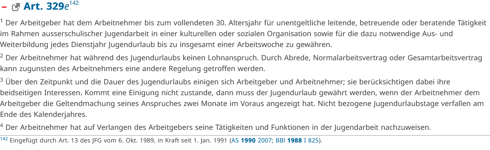 Gemäss Art. 329e OR können Lernende sowie Arbeitnehmer:innen, die ehrenamtlich in einer kulturellen oder sozialen Institution in der Jugendarbeit tätig sind, bis zum vollendeten 30. Altersjahr Jugendurlaub beziehen. Jugendurlaub wird für maximal 5 Arbeitstage pro Jahr bewilligt. Er kann auch tage- und halbtageweise bezogen werden. Der Urlaub ist unbezahlt.
